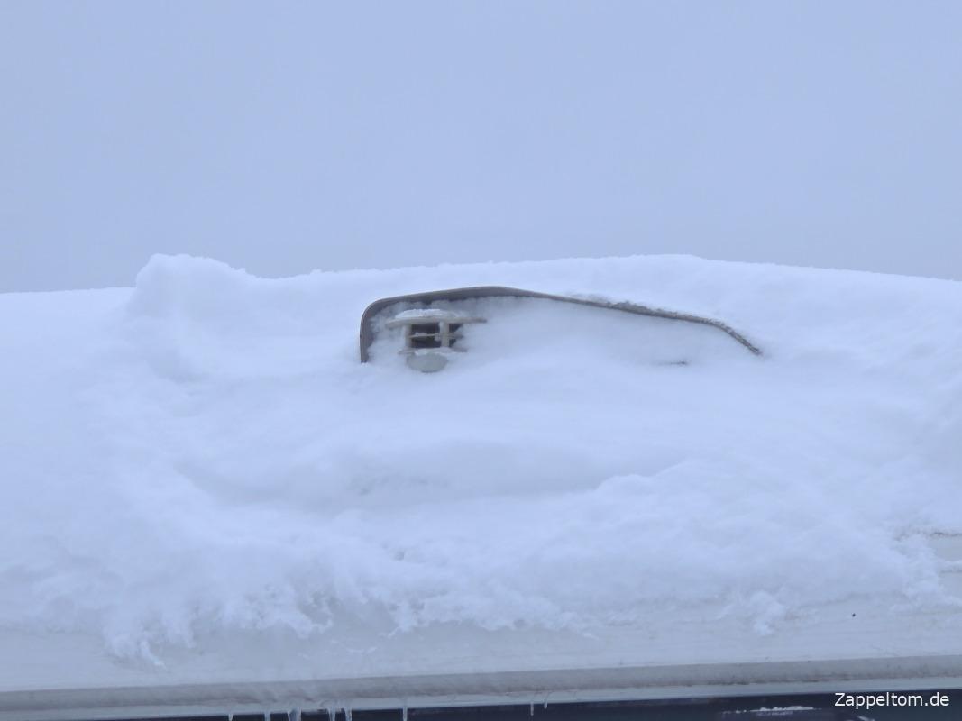 Wie gut die Dämmung des Wohnmobils ist, sieht man am Schnee auf dem Dach. Der bleibt nämlich einfach liegen. Und da fängt das erste Problem an. Denn eine schneebedeckte Solaranlage bringt keinen Ertrag. Also muss ich regelmäßig den Schnee vom Dach kehren. Und wie man sieht, bin ich darauf gar nicht richtig vorbereitet. Ist halt mein erster Solarwinter.
