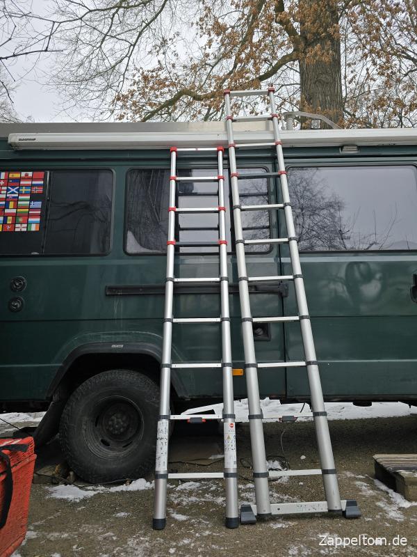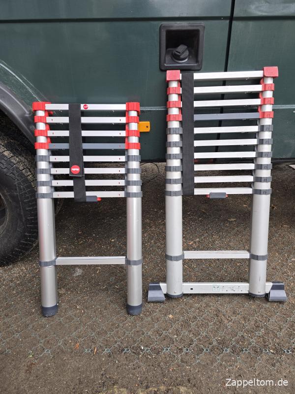 Die kleinere Leiter sitzt zumindest bei meinem um 10 cm höher gelegten Bus sogar besser, weil genau an der Dachrinne und unter der Markise. Von der Funktion her sind beide Leitern genial, weil man die leicht transportieren, flexibel in der Höhe arretieren und einfach mit einem Handgriff in sich zusammenrutschen lassen kann.