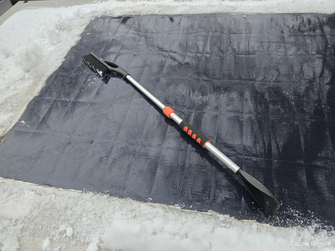 Kaufe mir also unterwegs aus irgendeiner Supermarktgrabbelkiste einen Teleskop-Schneebesen für die Solaranlage. Der ist schon besser als mein Provisorium, aber mittlerweile weiß ich, dass es auch welche mit verstellbarem Schneebesen gibt. Da kann man den Schnee ganz normal schieben und muss den nicht so quer wischen. Aber naja, jetzt habe ich den.