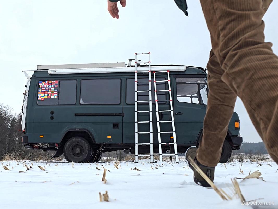 Warum ich im Winter aufs Camperdach muss und Test, ob die 11- oder 9-stufige Auszugsleiter Hailo Flexline besser ist.