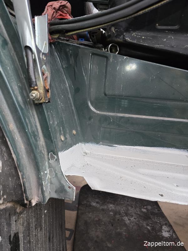 Das Absetzen der neuen Trittstufe spare ich mir, da sich das Reparaturblech sowieso unter der Plastikverkleidung der Einstiegsstufe und dem Türgummi versteckt. Kann also jetzt die Kanten am Reparaturblech der Trittstufe verschweißen. Das gibt mehr Stabilität.