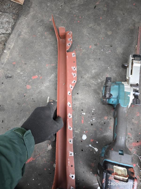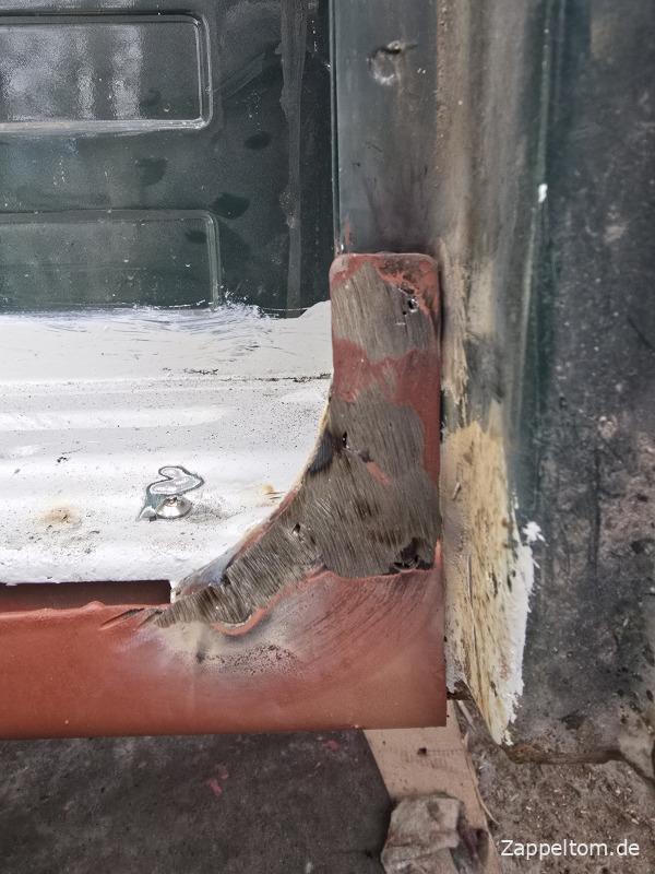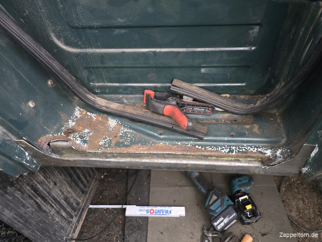 Wenn das Reparaturblech für die Trittstufe fertig ist, kann ich auch die rostigen Stellen der alten Trittstufe raustrennen. Jetzt sieht man, was das hier werden soll.