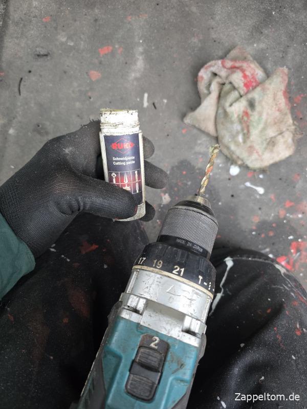 Muss auch noch ein paar Löcher bohren, wo ich mit der Lochzange nicht hinkomme. Beim Bohren von Karosserieblech nehme ich mittlerweile immer Bohrpaste. Das geht einfach wesentlich besser und schont die Bohrer. Ich weiß auch nicht, was Mercedes da verbaut, aber das Blech frisst mir sonst die guten Ruko-Bohrer regelrecht.
