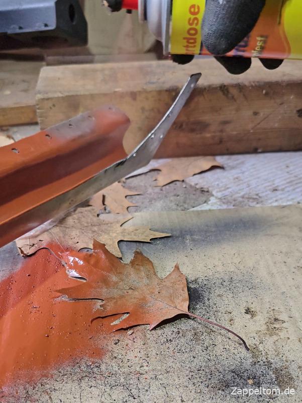Zur Schweißvorbereitung gehört auch der Rostschutz. An den Schweißpunkten muss ich die Farbe zwar später wieder runterschleifen, aber immerhin ist Brantho Nitrofest (nur!) in rotbraun bis 300° hitzefest. Da bleibt also beim Schweißen viel vom wichtigen Rostschutz stehen.