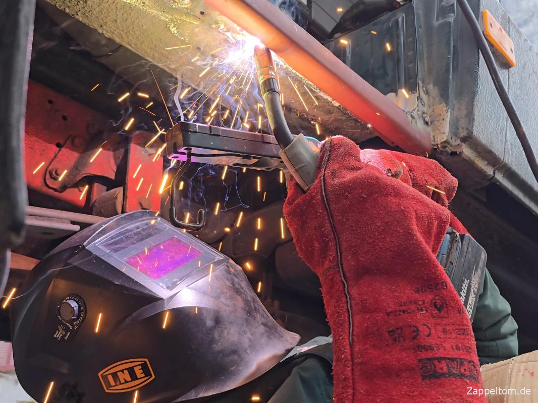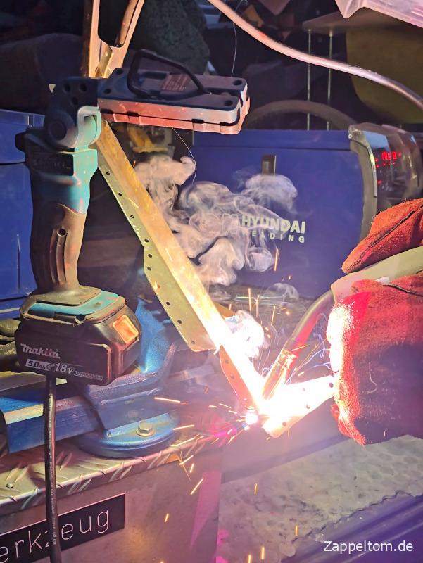 Ist zwar kein Wind heute, aber ich schweiße trotzdem mit dem Fülldrahtschweißgerät von Hyundai. Das ist einfach handlicher, als auch noch eine Argonflasche rumzuschleppen. Und seit ich mitgekriegt habe, dass man beim Fülldrahtschweißen Plus auf Masse klemmen muss, schweißt das auch ordentlich.