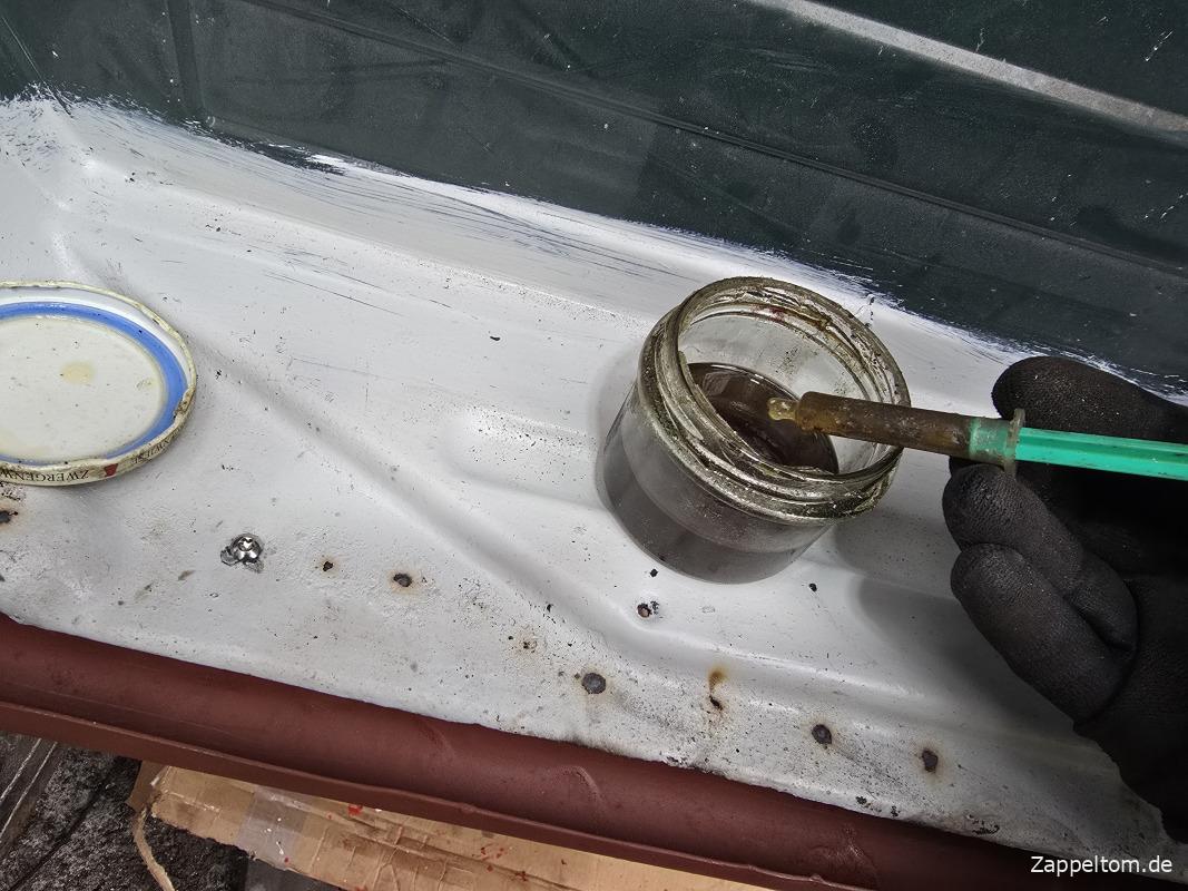 Die schöne Schweißarbeit wäre aber völlig umsonst, wenn ich das Reparaturblech und die Trittstufe nicht mit Rostschutz nachbehandeln würde. Flute also mit einer kleinen Spritze mehrfach Owatrol in die Zwischenräume.