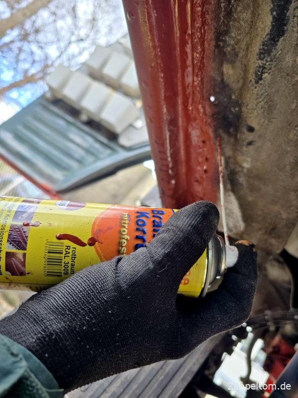 Wenn das Owatrol nach ein paar Tagen in alle Ritzen gekrochen und halbwegs ausgetrocknet ist, gibt es noch Rostschutz der Schweißstellen mit Brantho Korrux Nitrofest. Hier macht sich die Komfortspraydose mit dem langen Sprührohr perfekt. Damit kommt man wirklich in jede Ecke.