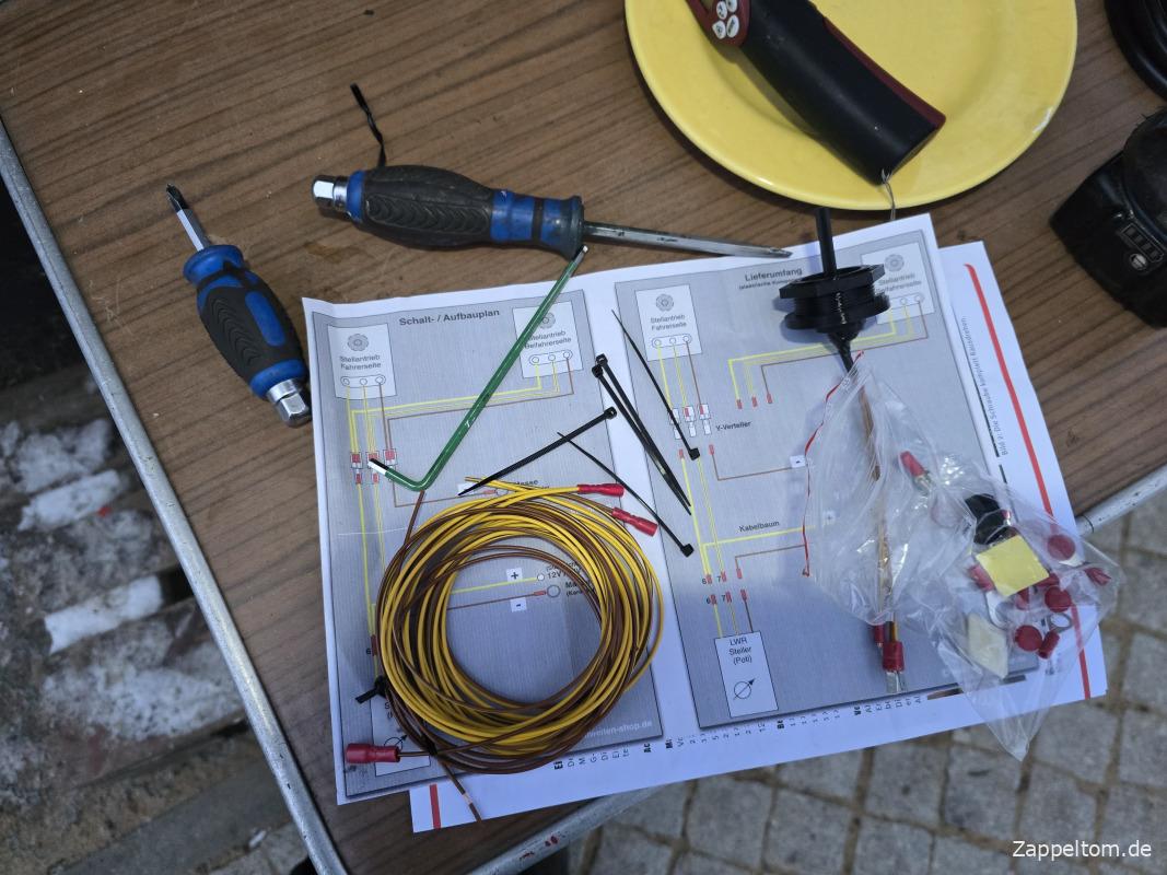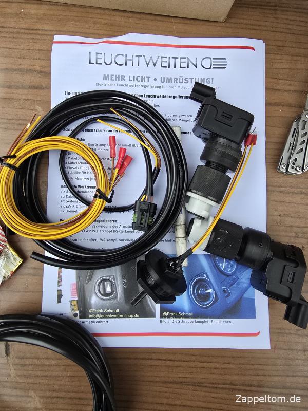 Mir gefällt, dass der elektrischer Drehschalter vom Leuchtweiten-Shop denselben Durchmesser wie das Mercedes-Teil hat und insofern in die originale Aufnahme passt. Ein sauberer Schaltplan ist auch dabei.