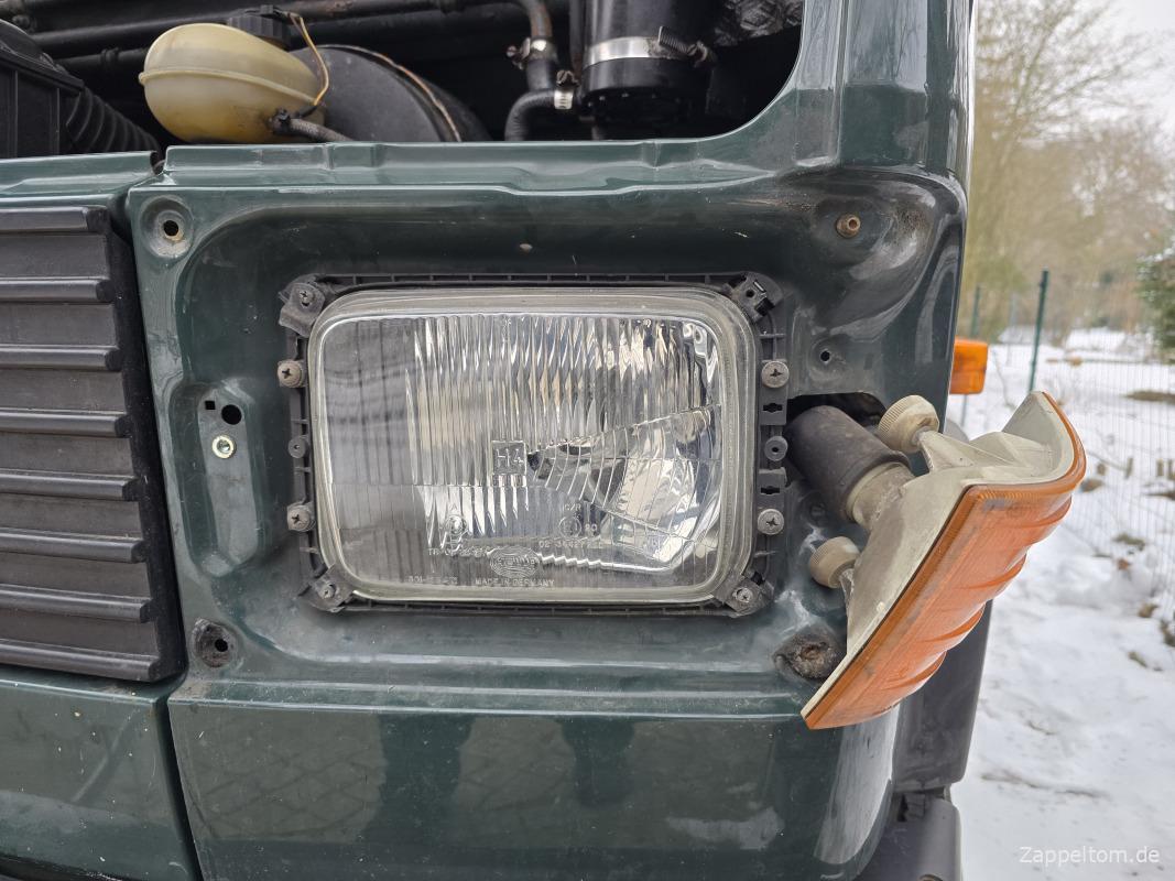 Die Stellmotoren der Leuchtweitenregelung haben hinten einen zur originalen LWR identischen Bajonettverschluss, das ist ganz einfach gelöst. Nur am rechten Scheinwerfer ist die Montage der elektrischen LWR-Motoren am Mercedes 711D ziemlich fummlig. Hätte ja auch gleich den dummen Wischwasserbehälter ausbauen können.