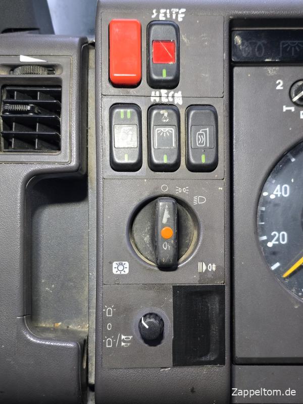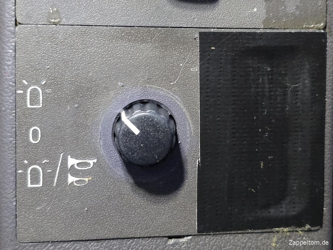 Lasst euch jetzt nur nicht irritieren, dass der Drehschalter für die Leuchtweitenregelung bei mir links unten im Armaturenbrett sitzt. Original ist der auf der rechten Seite. Dort ist bei mir nun das Autoradio eingebaut. Was ich aber zeigen will, ist die präzise Passung des neuen Drehschalters in die alte Abdeckung der Signalanlage. Die Beschriftung passt zwar nicht ganz, aber das nenne ich mal originalgetreu. Daneben muss erstmal Panzerband herhalten. Ich weiß, dass ich da noch eine originale Abdeckung habe, finde die aber gerade nicht. Man muss eben alles aufheben.