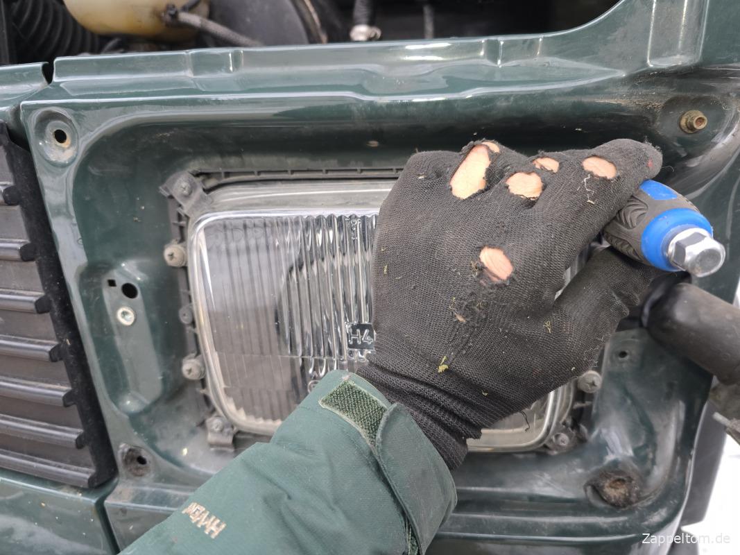 Wenn der Reflektor sicher verbunden ist, kann man die Streuscheibe mit den 4 Halteklammern wieder montieren. Den Reflektor vorsichtig zu putzen, schadet auch nicht. Und ja, ich weiß, ich bräuchte neue Arbeitshandschuhe. Am besten bei der Kälte wäre eine gefütterte Variante.