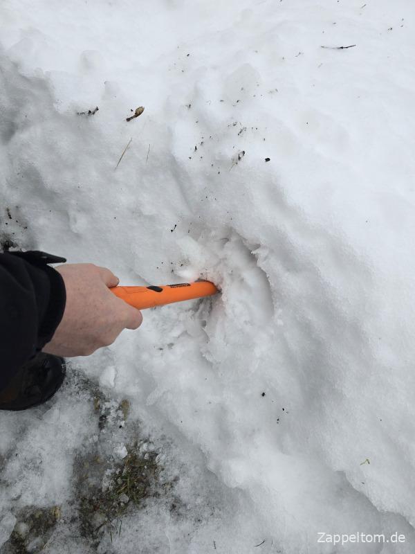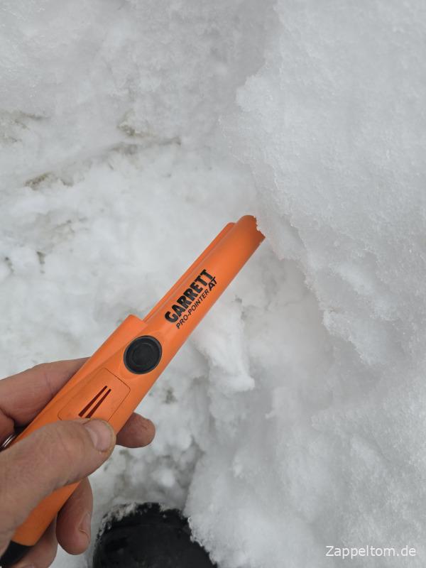 Der Pointer funktioniert genauso wie ein großes Metallsuchgerät, kann aber viel zielgerichteter arbeiten. Und das ist bei der Suche nach einem Handy im tiefen Schnee besonders wichtig. Zumal mittlerweile der Schnee oben drüber schon zerfahren und verdichtet ist.