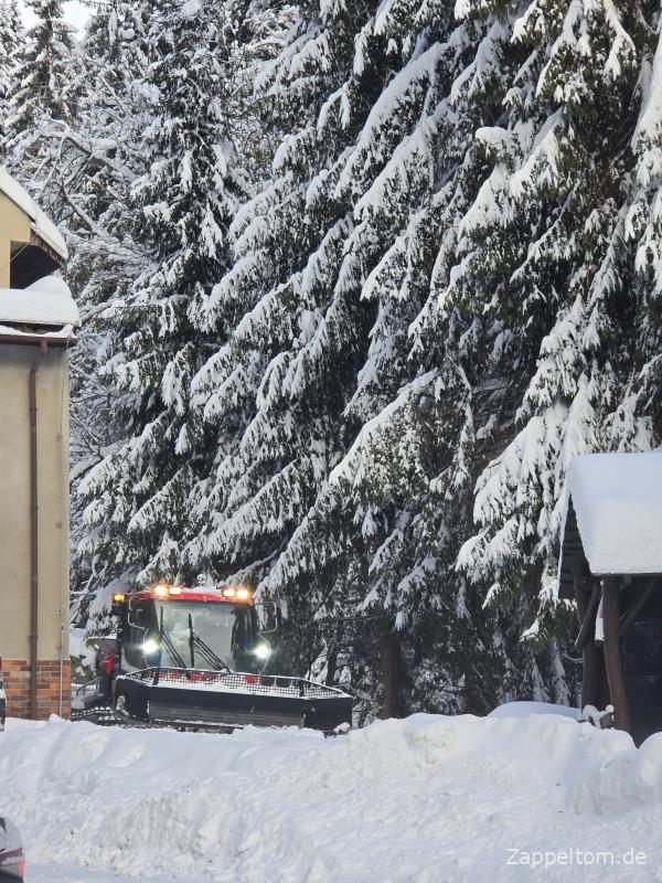 Ich erspare mir jetzt mal das zugehörige Foto. Aber diesmal ist mir in der Nacht der Urintank eingefroren. Der ist zwar beheizt, aber nachts ist die Heizung aus. Das heißt also Pullern im Schnee. Ich frage mich, wieso man dabei ein Handy braucht, aber nun ist es weg. Verloren im tiefen Schnee. Gemerkt erst Stunden später. Und der Pistenbully macht die Sache mit dem verlorenen Handy im Schnee auch nicht besser.