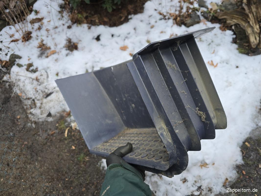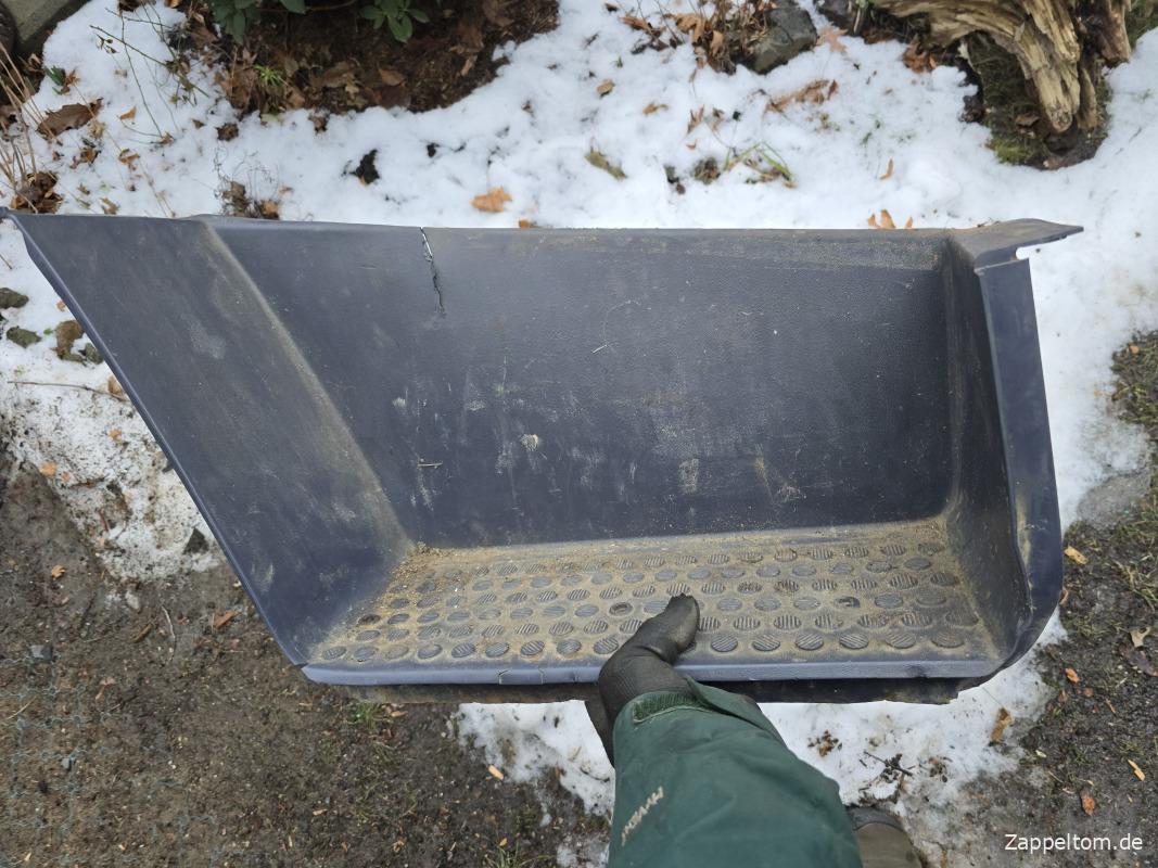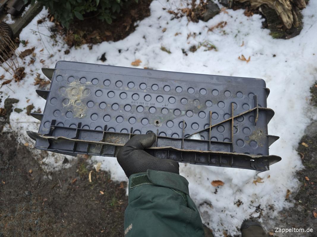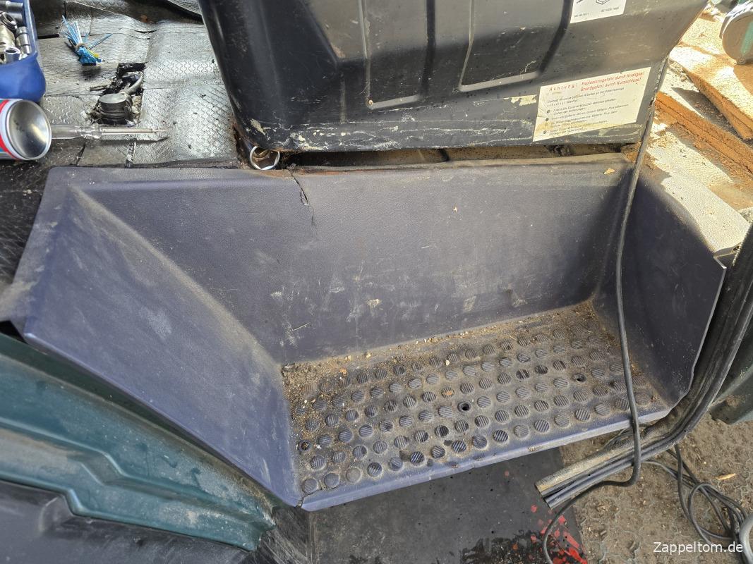 Das Problem ist nur, dass die hübsche Verkleidung den Blick aufs Blech verhindert und es da drunter übel rosten kann. Dazu ist die Demontage gar nicht so einfach. Aber jetzt muss ich die Verkleidung rausnehmen, weil die Trittstufe darunter schon durchgerostet ist.
