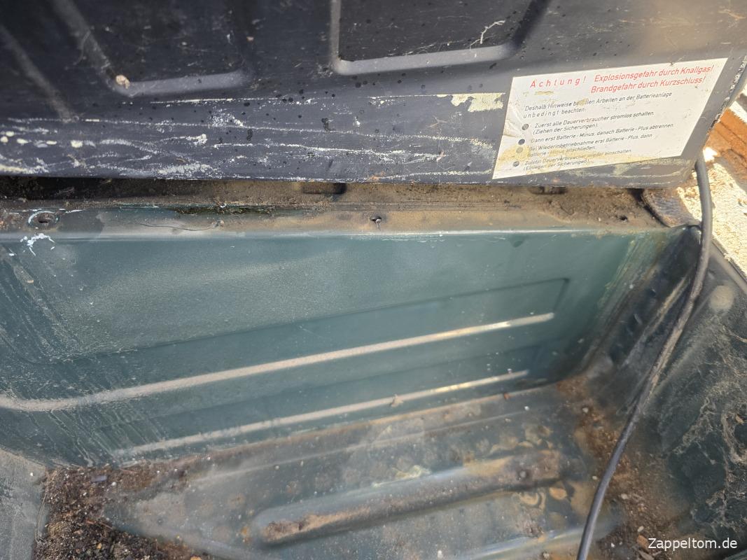 Bei mir hat sich scheinbar schon mal jemand (war ich das?) mit brachialer Gewalt an der Demontage der Einstiegsverkleidung versucht. Deswegen ist die Verkleidung auf Höhe des Batteriekasten schon eingerissen. Aber bevor man die Verkleidung des Auftritts abnehmen kann, muss der Batteriekasten auf der Fahrerseite zumindest leicht angehoben werden.